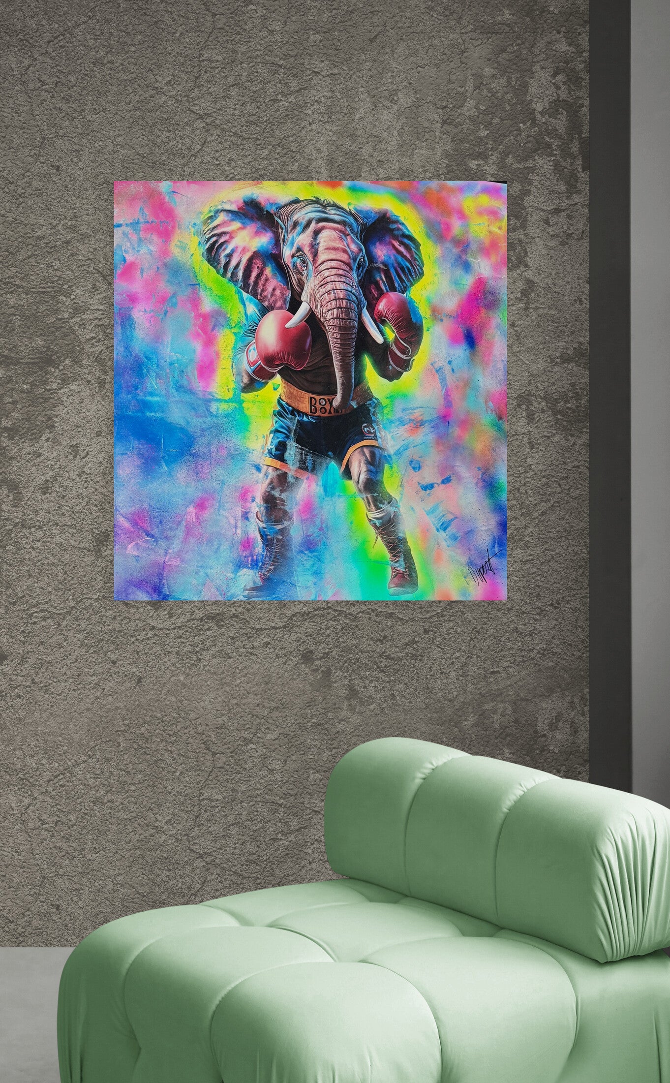 The piece is a fusion of digital and analogue techniques. The elephant was first designed and printed directly onto canvas in Adobe Illustrator as a series of iconic shapes. I then continued working on it over several months, building up layers of acrylic paint to add depth, texture, and energy to the motif.